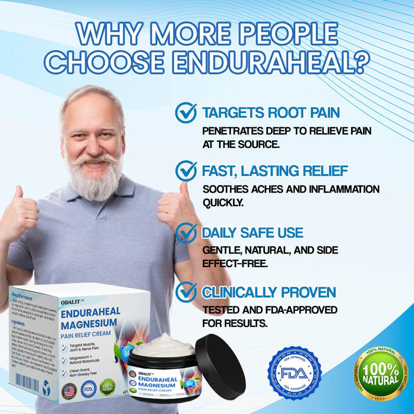 Most magnesium supplements get lost in your digestive system, never reaching the areas that hurt the most. ODALIT™ EnduraHeal is packed with Advanced Direct Absorption Technology, this powerful cream sends magnesium straight through your skin to the exact spots you need relief—targeting sore muscles, aching joints, and nerve pain at the source.